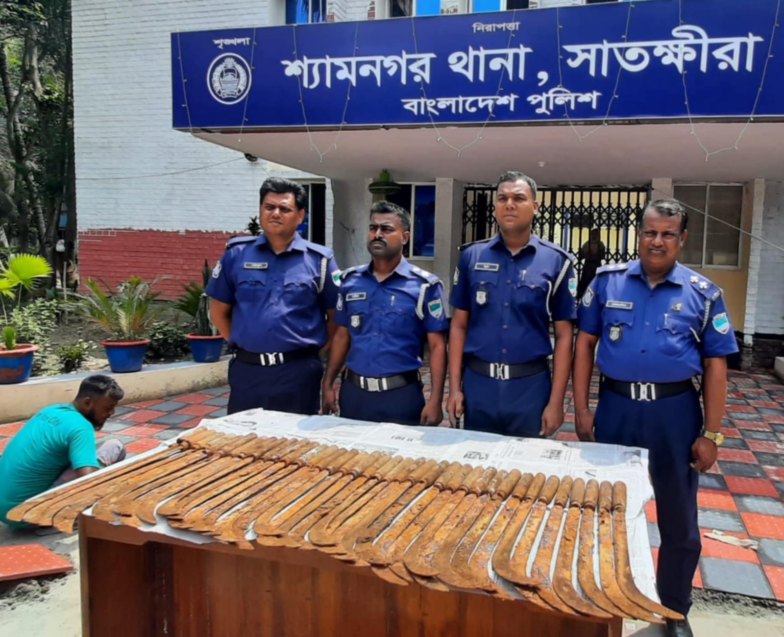 শ্যামনগরে গোপন সংবাদের ভিত্তিতে থানা পুলিশ গত ২২ এপ্রিল সকাল ৯টার সময উপজেলা বাস্তহারা লীগের সভাপতি নকিপুর গ্রামের মোকছেদ আলীর ছেলে রহমত আলীর ঘরের সামনে ও মৃত জোনাব গাজীর ছেলে বিল্লাল গাজীর পরিত্যক্ত ডোবা থেকে প্লাস্টিকের বস্তায় মুখ বাধা দেশীয় অস্ত্র উদ্ধার করেন।