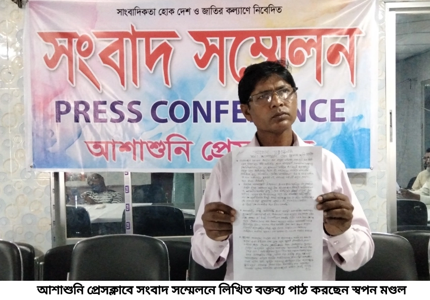 রবিবার সকাল ১০টায় আশাশুনি প্রেসক্লাবে এ সংবাদ সম্মেলন অনুষ্ঠিত হয়। লিখিত বক্তব্য পাঠ করেন শ্রীউলা ইউনিয়নের নাকতাড়া গ্রামের গণেশ চন্দ্র মণ্ডলের ছেলে স্বপন মণ্ডল।