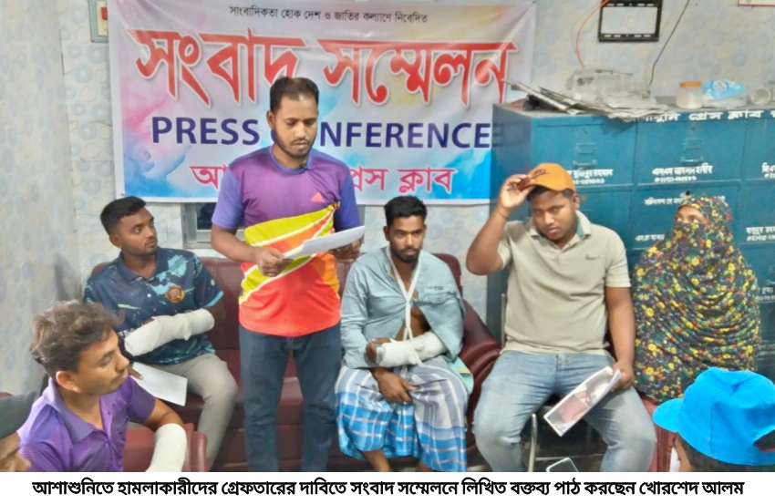 বৃহস্পতিবার দুপুরে আশাশুনি প্রেসক্লাবে সংবাদ সম্মেলনে লিখিত বক্তব্য পাঠ করেন আশাশুনি গ্রামের মৃত আফতাব উদ্দিনের ছেলে হামলায় আহত মুরশিদ আলম।