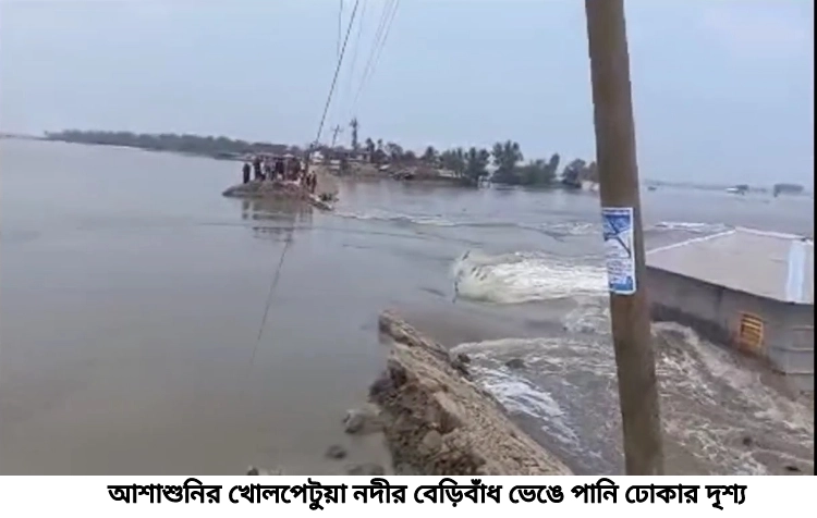 আশাশুনির খোলপেটুয়া নদীর বেড়িবাঁধ ভেঙে অন্তত ১০টি গ্রাম প্লাবিত হয়েছে। এতে হাজার হাজার বিঘা মৎস্য ঘের তলিয়ে গেছে। গ্রামবাসীদের ঈদ আনন্দ হয়ে উঠেছে উদ্বেগের কারণ।