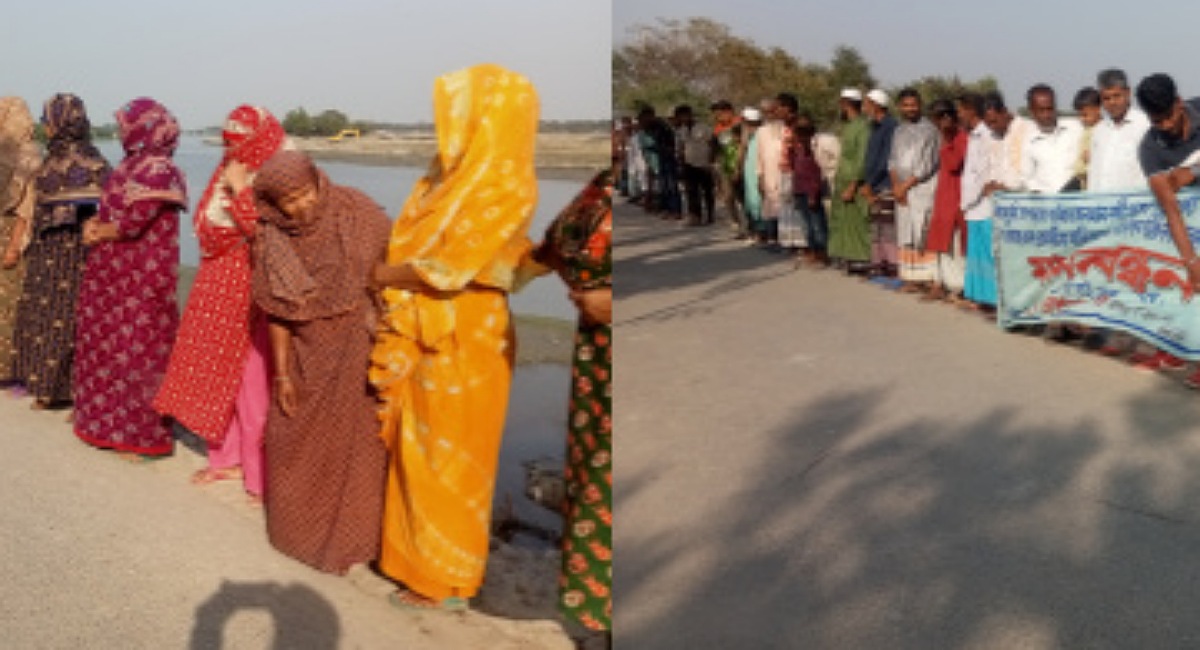 কাজে হাত দেওয়া হলেও পরে সকল শ্রমিক পালিয়ে চলে গেছে জানিয়ে বক্তগণ বলেন, নদীতে বাঁধ দেয়া, ভরাট হওয়া মাটি ভাঙ্গন প্রান্তে এনে ফেলে রক্ষা বাঁধ দেওয়া, জিও ব্যাগ ফেলানোর কাজ অবিলম্বে শুরু করতে হবে। খাস জমি বাদ রেখে রেকর্ডীয় জমির উপর দিয়ে খনন করা হচ্ছে, তাও আমরা মেনে নিয়েছি, ভাঙ্গন স্থানে রক্ষা বাঁধ নির্মানের কথা বলায়। সম্প্রতি আরও ৮ টি বসতবাড়ি নদীতে বিলীন হয়েছে। ১৫টি বাড়ী হুমকীতে রয়েছে। মাধ্যমিক, প্রাথমিক বিদ্যালয়, মাদ্রাসা, মসজিদ, ভাঙ্গনের মুখে রয়েছে।
