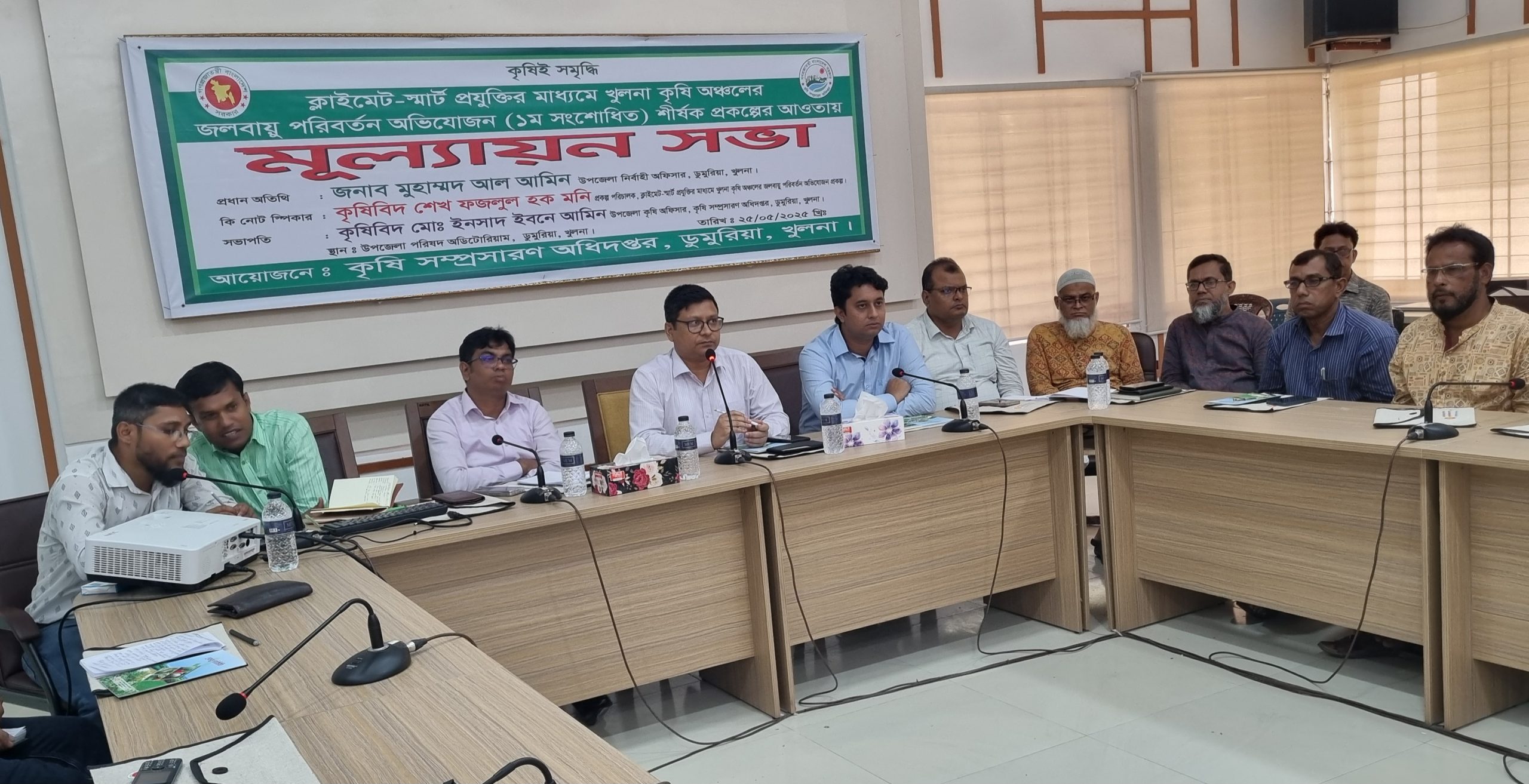 খুলনার ডুমুরিয়া কৃষি সম্প্রসারণ অধিদপ্তরের আয়োজনে ক্লাইমেট স্মার্ট প্রযুক্তির মাধ্যমে খুলনা কৃষি অঞ্চলের জলবায়ু পরিবর্তন অভিযোজন প্রথম সংশোধিত প্রকল্পের আওতায় মূল্যায়ন সভা মঙ্গলবার (২৫ মে) সকাল ১১ টায় ডুমুরিয়া উপজেলা প্রশাসনিক ভবন সম্মেলন কক্ষে এ সভা অনুষ্ঠিত হয়।