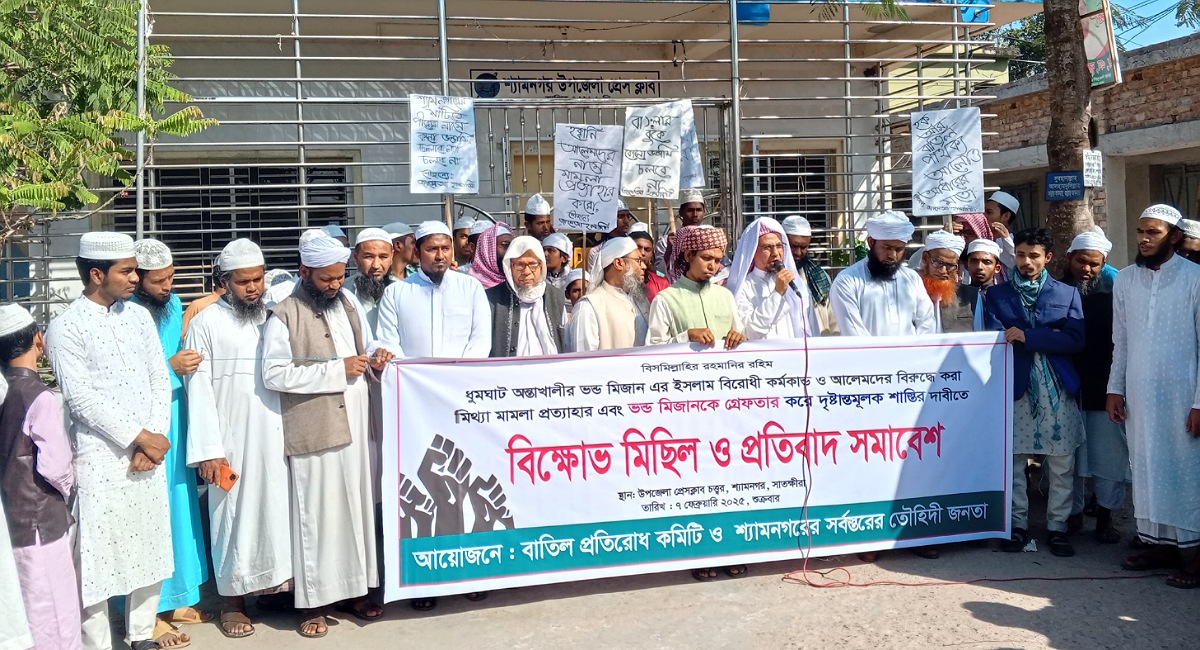 সাতক্ষীরার শ্যামনগরে নিজেকে পীর দাবি করা মিজানুর রহমানকে গ্রেপ্তারসহ তার ইসলাম বিরোধী কর্মকান্ড বন্ধের দাবিতে বিক্ষোভ মিছিল হয়েছে। শুক্রবার জুমার নামাজের পর থানা মসজিদ থেকে শুরু হয়ে বিভিন্ন সড়ক প্রদক্ষিণ শেষে মিছিলটি প্রেসক্লাব চত্বরে পৌছে প্রতিবাদ সমাবেশ করে।