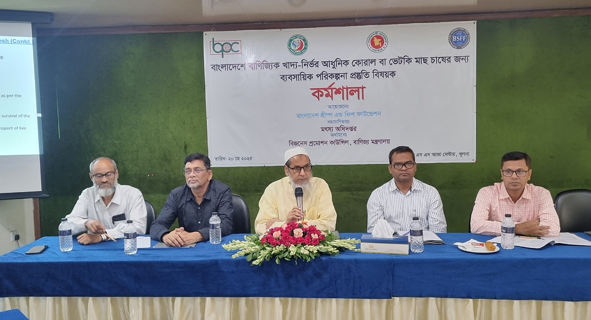 মঙ্গলবার ২০ মে ২০২৫ সকাল ১১টায় খুলনাতে অবস্থিত সিএসএস আভা সেন্টার এ বাণিজ্য মন্ত্রণালয়াধীন বিজিনেস প্রমোশন কাউন্সিল (বিপিসি) এর আর্থিক সহযোগীতায় এবং মৎস্য অধিদপ্তরের সার্বিক সহযোগীতায় বাংলাদেশ শ্রিম্প এন্ড ফিশ ফাউন্ডেশন (বিএসএফএফ) 'বাংলাদেশে আধুনিক প্রযুক্তিতে বাণিজ্যিক খাদ্য-নির্ভর কোরাল/ভেটকি মাছ চাষের জন্য ব্যাংকযোগ্য ব্যবসায়িক পরিকল্পনা প্রস্তুতি বিষয়ক' কর্মশালার আয়োজন করে।