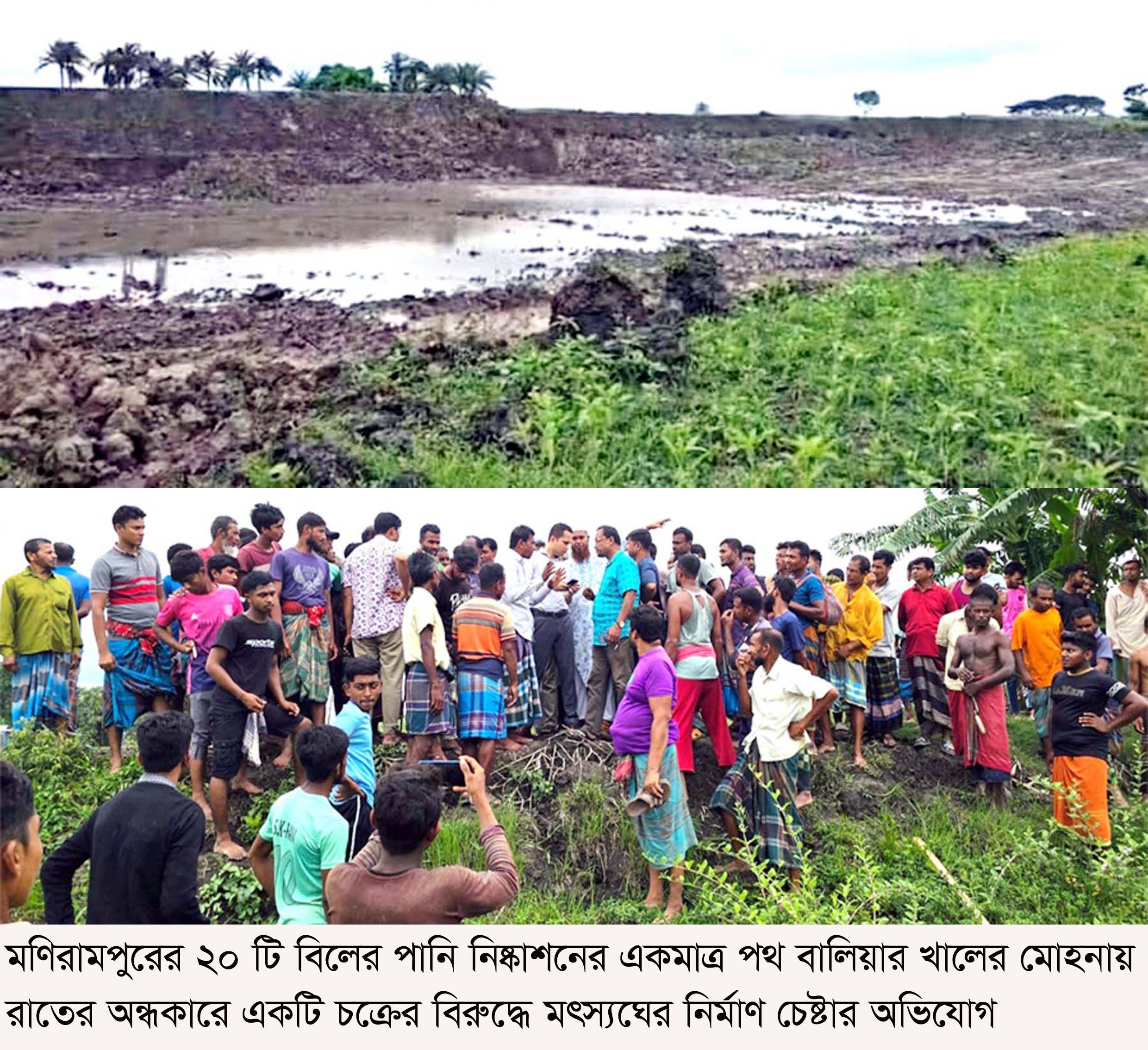 মণিরামপুরের রাজগঞ্জ এলাকার ২০ টি বিলের পানি নিষ্কাশনের একমাত্র পথ বালিয়ার খালের মোহনায় অবৈধভাবে রাতের অন্ধকারে একটি চক্রের বিরুদ্ধে মৎস্যঘের নির্মাণ চেষ্টার অভিযোগ পাওয়া গেছে।