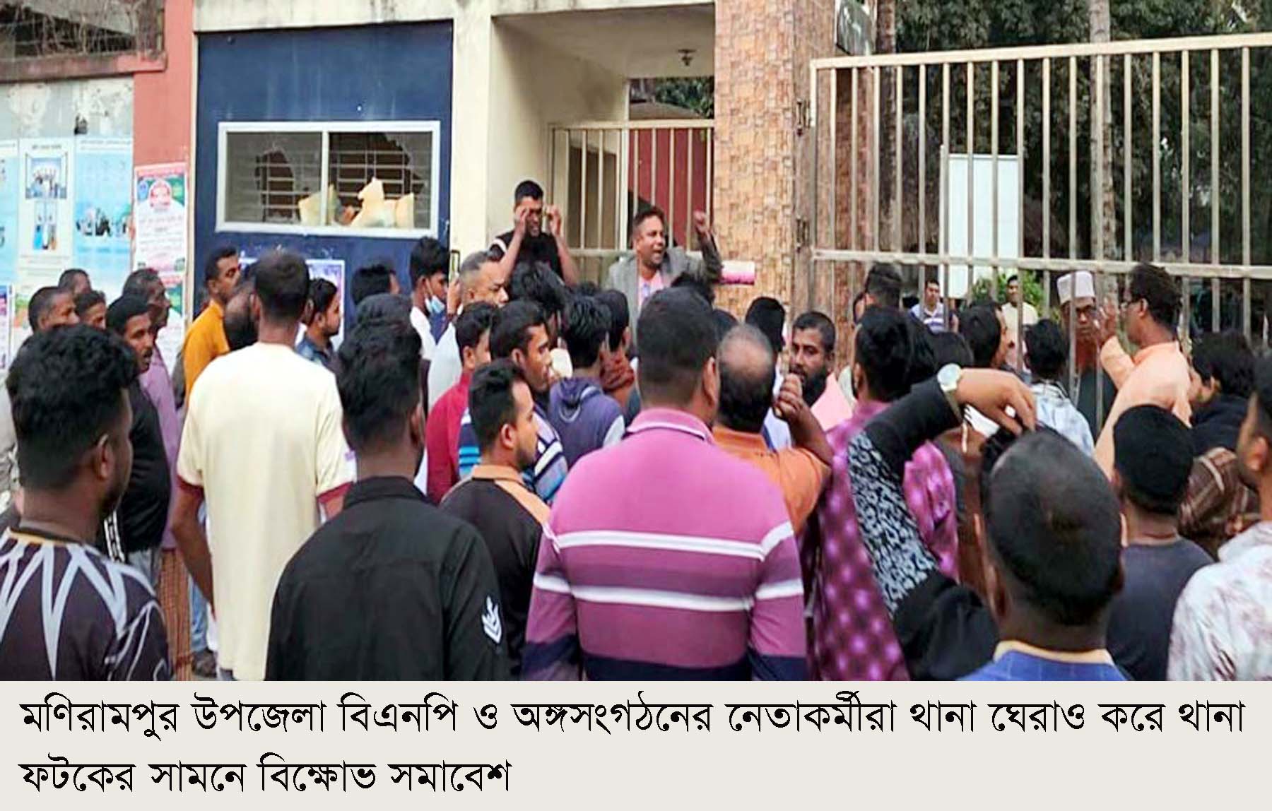 মণিরামপুর উপজেলা বিএনপি ও অঙ্গসংগঠনের নেতাকর্মীরা থানা ঘেরাও করে থানা ফটকের সামনে বিক্ষোভ সমাবেশ করেছে। বিগত সরকারের আমলে থানায় ধরে এনে শত শত বিএনপির নেতাকর্মীদের মিথ্যা মামলায় জেলহাজতে পাঠানো হতো। দিনের পর দিন মিথ্যা মামলায় হাজতবাস করতে হয়েছে। অথচ সুনির্দ্দিষ্ট অভিযোগে আসামি ধরে এনে থানা থেকে ছেড়ে দেয়া হচ্ছে। থানার ওসির বিরুদ্ধে এসব অভিযোগ এনে এ ঘেরাও কর্মসুচী ও বিক্ষোভ সমাবেশ করেছে।
