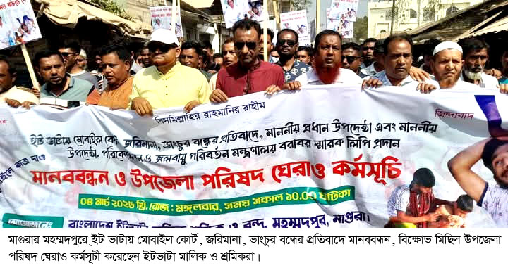মাগুরার মহম্মদপুরে বিক্ষোভ মিছিল, মানববন্ধন ও উপজেলা পরিষদ ঘেরাও কর্মসূচি করেছেন ইটভাটার মালিক ও শ্রমিকরা। তাদের দাবী ইটভাটায় মোবাইল কোর্ট, জরিমানা ও ভাঙচুর করা যাবে না, তার প্রতিবাদে মঙ্গলবার (৪ মার্চ) দুপুরে ইউএনও অফিস ঘেরাও করে এই মানববন্ধন ও বিক্ষোভ মিছিল করেন। পরে উপজেলা নির্বাহী অফিসার শাহীনুর আক্তারের কাছে উপজেলার ৩১টি ইটভাটার পক্ষে ইটভাটা মালিক সমিতির নেতারা স্মারক লিপি প্রদান করেন।