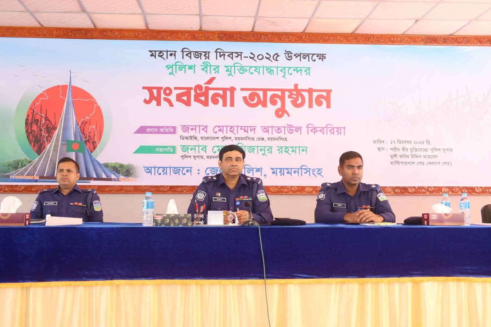 মহান বিজয় দিবস-২০২৫ উপলক্ষে ময়মনসিংহ জেলা পুলিশের উদ্যোগে বীর মুক্তিযোদ্ধাদের সংবর্ধনা অনুষ্ঠান অনুষ্ঠিত হয়।